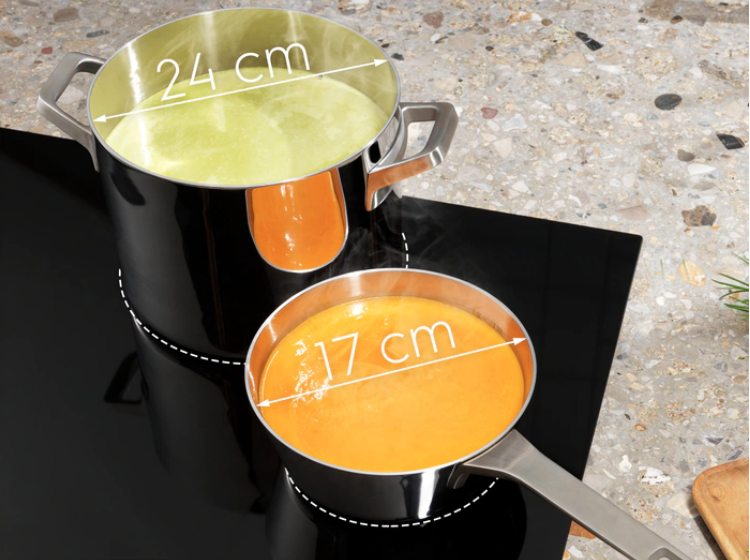 Płyta TotalFlex automatycznie wykrywa garnki i patelnie o różnych kształtach i tworzy pole grzejne zgodne z ich kształtem. Czyli możesz postawić naczynie w dowolnym miejscu na płycie.