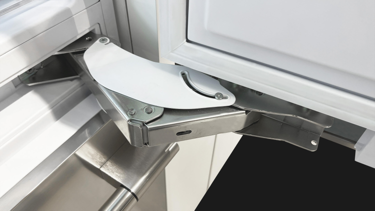 Płaskie zawiasy pozwalają na otwarcie drzwi w obrysie zabudowy, a ich wysoka wytrzymałość pozwala na drzwiach zawiesić front meblowy lub kamienny.