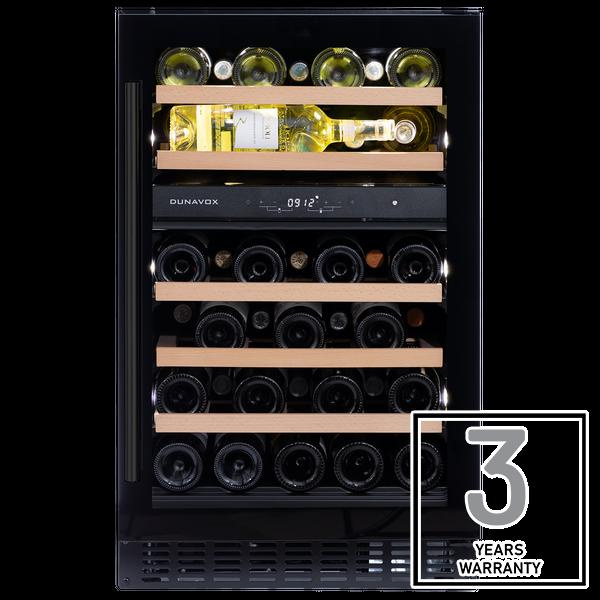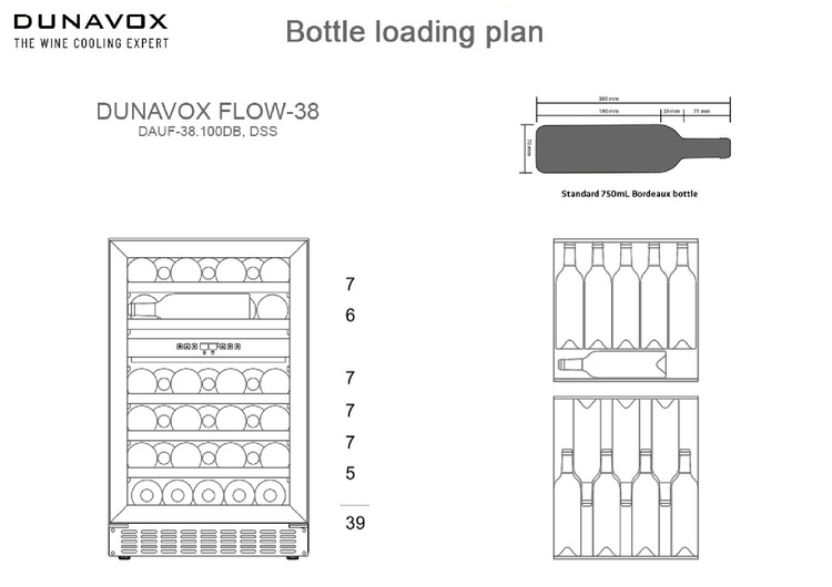 Dwustrefowy, zintegrowany model mogący pomieścić 38 butelek wina. Elegancki wygląd zewnętrzny i uchwyt ze stali nierdzewnej sprawiają, że DUNAVOX Flow-38 idealnie pasuje do nowoczesnej kuchni. Butelki są eksponowane na półkach z litego drewna bukowego i otoczone białym, bursztynowym i niebieskim oświetleniem wewnętrznym LED Temperatura w górnej strefie musi być niższa niż w dolnej, zalecana różnica temperatur wynosi 4°C. Należy pamiętać, że ten model nadaje się do użytku wolnostojącego lub do zabudowy.