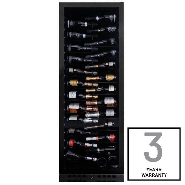Jednostrefowy, wolnostojący model do przechowywania 143 butelek z serii Sera firmy Dunavox. Elegancki wygląd zewnętrzny - wersja Inox posiada uchwyt ze stali nierdzewnej, a wersja czarna posiada uchwyt również w kolorze czarnym. DUNAVOX Sera-143 pasuje idealnie do nowoczesnych kuchni, restauracji i hoteli. Butelki są umieszczone na opatentowanych półkach i oświetlone z dwóch stron białym, bursztynowym i niebieskim oświetleniem LED. Należy pamiętać, że ten model nadaje się do użytku wolnostojącego lub do zabudowy.