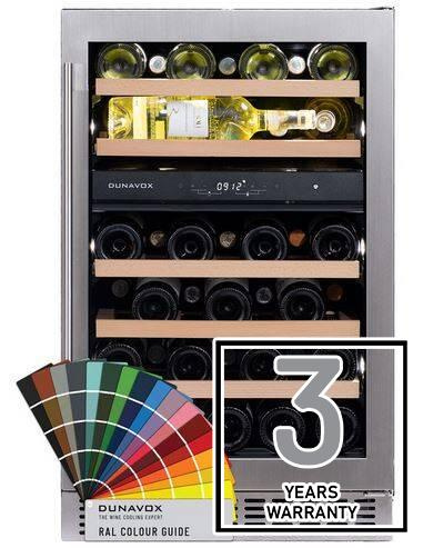 Dwustrefowy, zintegrowany model mogący pomieścić 38 butelek wina. Elegancki wygląd zewnętrzny i uchwyt ze stali nierdzewnej sprawiają, że DUNAVOX Flow-38 idealnie pasuje do nowoczesnej kuchni. Butelki są eksponowane na półkach z litego drewna bukowego i otoczone białym, bursztynowym i niebieskim oświetleniem wewnętrznym LED Temperatura w górnej strefie musi być niższa niż w dolnej, zalecana różnica temperatur wynosi 4°C. Należy pamiętać, że ten model nadaje się do użytku wolnostojącego lub do zabudowy.