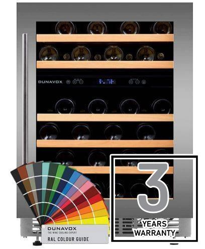 Dwustrefowy, model podblatowy mogący pomieścić 46 butelek wina. Wyróżnia się elegancką obudową i wyświetlaczem LCD. Model DUNAVOX Flow- 46D pasuje idealnie do nowoczesnej kuchni. Butelki są umieszczone na teleskopowych szynach i oświetlone białym, bursztynowym i niebieskim oświetleniem wewnętrznym LED. Temperatura w górnej strefie musi być niższa niż w dolnej. Należy zwrócić uwagę, że model ten jest przeznaczony do zabudowy podblatowej.