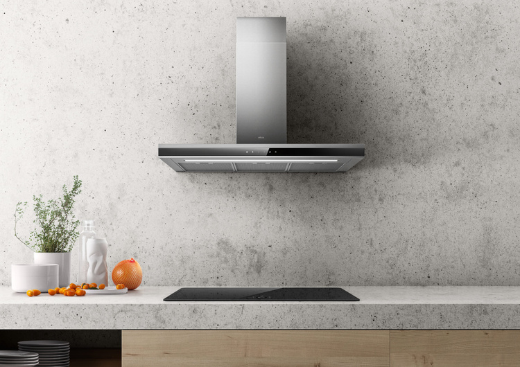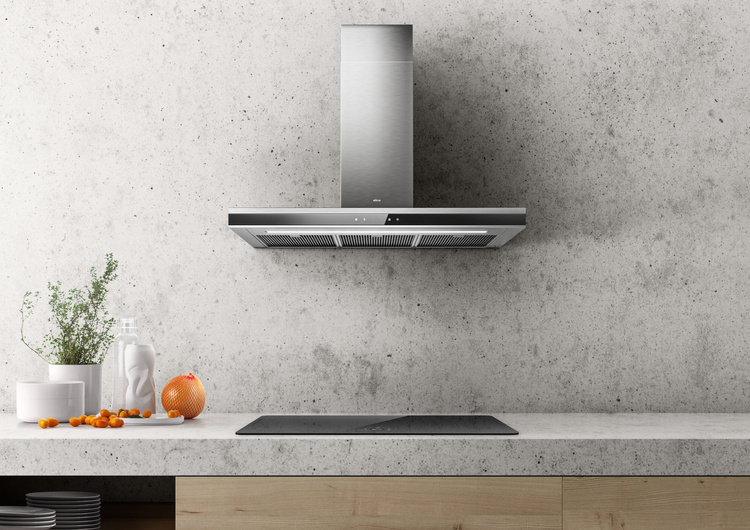 Panel przedni z czarnego szkła osadzony jest w aluminiowej ramie, podkreślając linie projektu tego urządzenia. Sterowanie dotykowe jest ukryte za szkłem, a diody LED oświetlają płytę grzewczą przy niskim zużyciu energii. Okapem można zarządzać zdalnie, za pomocą aplikacji lub asystenta głosowego. Można też podłączyć go przez Bluetooth do płyty indukcyjnej Elica, dostosowując moc pochłaniania do aktywnych stref gotowania.