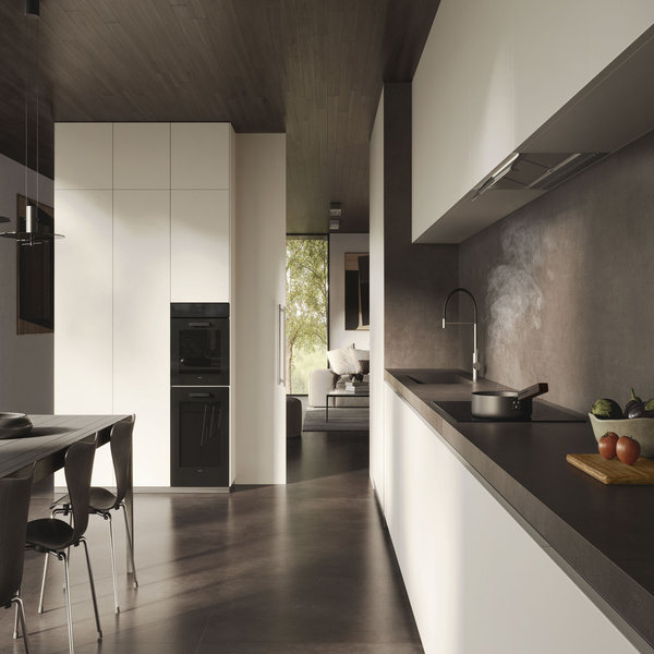 Okap i płyta, w ciągłym dialogu. Jest to połączenie okapu i płyty indukcyjnej za pomocą bluethooth, które automatycznie dostosowuje siłę zasysania w oparciu o wybrany poziom gotowania. Optymalizując wydajność i zużycie energii.