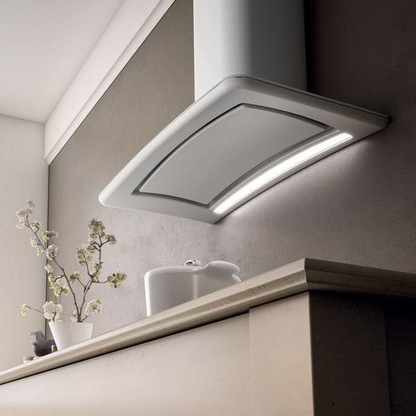 Montowany na ścianie okap kuchenny o zaokrąglonych kształtach, które w nowoczesny sposób reinterpretują tradycyjną kuchenną stylistykę zabudowy. Obudowa skrywa wnętrze niezwykle wydajnego systemu wyciągu i efektywnych filtrów.