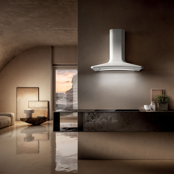 Montowany na ścianie okap kuchenny o zaokrąglonych kształtach, które w nowoczesny sposób reinterpretują tradycyjną kuchenną stylistykę zabudowy. Obudowa skrywa wnętrze niezwykle wydajnego systemu wyciągu i efektywnych filtrów.