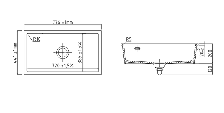 - UWAGA: Zalecamy, ze względu na tolerancję wymiarów (+/- 1,5%), wycinanie otworu w blacie przy użyciu dostarczonej sztuki zlewozmywaka. Zlewozmywak można podwiesić za pomocą zaczepów do blatów o grubości min. 30 mm. Jeśli zlewozmywak będzie przyklejony, mogą być użyte cieńsze blaty.