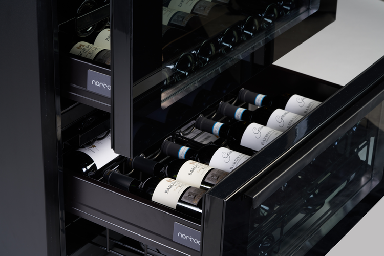Duża, jednostrefowa, winiarka szufladowa Norcool do zabudowy pod blatem kuchennym na 46 butelek