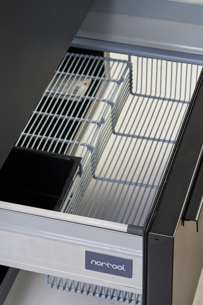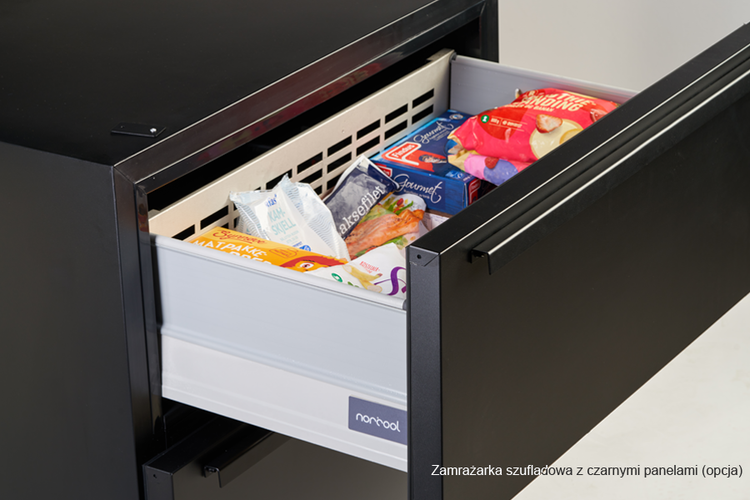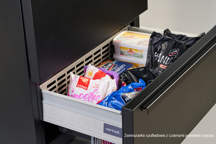 Zaprojektowana w Norwegii zamrażarka to rozwiązanie dla kuchni z otwartymi przestrzeniami i dużą ilością miejsca na blacie. Dzięki niej możesz umieścić produkty spożywcze w dwóch dużych szufladach pod kuchennym blatem. Szuflady są pojemne i zapewniają dobrą widoczność przechowywanych produktów. Wybierz spośród frontów w kolorze czarnym matowym, stali nierdzewnej lub w tym samym stylu co wystrój kuchni. Oferta szufladowych urządzeń podblatowych Norcool obejmuje chłodziarkę, zamrażarkę i winiarkę o tych samych wymiarach umożliwiających ich montaż obok siebie.