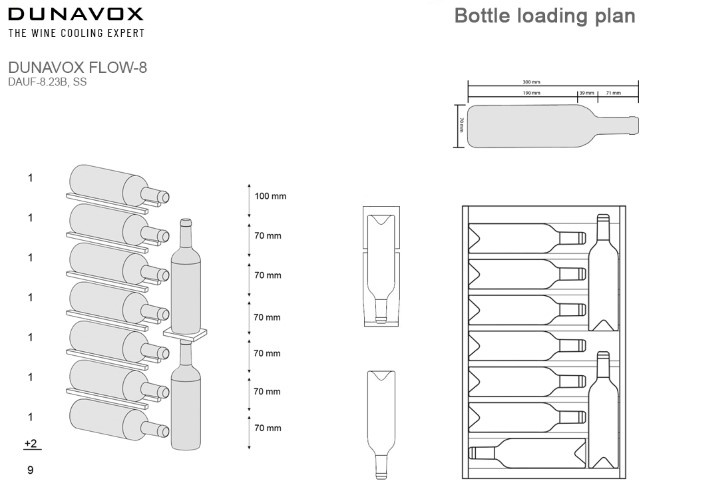• Pojemność - ilość butelek (butelka Bordeaux 0,75 litra) 9 (7 na półkach, 2 na stojąco)