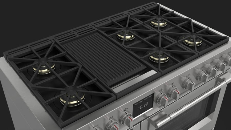 Siedem palników, w tym sześć z podwójnymi koronami Crescendo zasilanych gazem ziemnym (możliwość zmiany na LPG) wytwarza wystarczająco dużo ciepła, aby szybko zagotować lub usmażyć dowolną potrawę. Ciężkie, masywne, żeliwne mają równą powierzchnię zapewniając bezpieczeństwo i równowagę nawet bardzo ciężkich naczyń, a także wygodę w ich przesuwaniu.