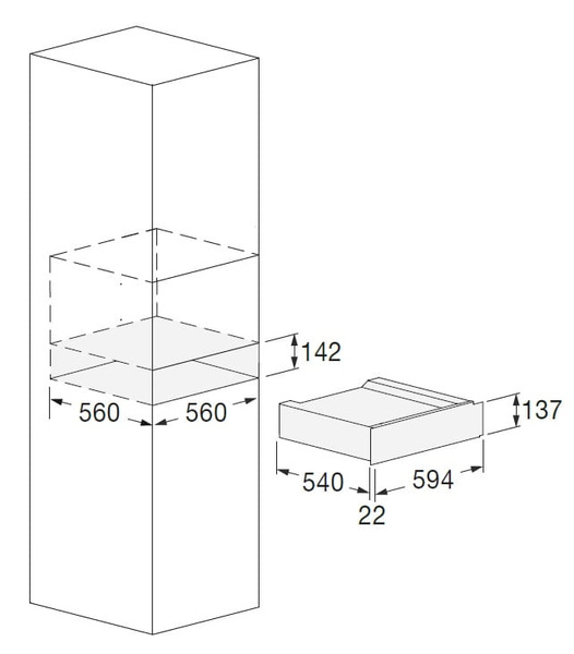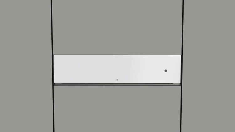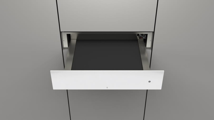 Szuflada nie ma bocznych ścianek, co umożliwia wygodne wyjmowanie talerzy i naczyń bez dotykania gorących elementów. Dzięki zachowaniu temperatury pokojowej front szuflady jest bezpieczny w dotyku, a otwieranie ułatwia system push/pull i całkowicie wysuwane prowadnice teleskopowe.