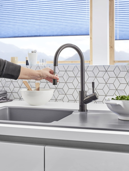 - możliwy montaż armatury bezpośrednio przy ścianie, ponieważ regulacja zimnej i ciepłej wody o 90° odbywa się w kierunku zlewozmywaka