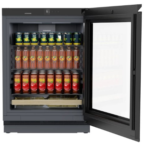 Połączenie eleganckiego wyglądu i praktyczności z myślą o wszystkich napojach: przezroczyste półki szklane ułatwiają przechowywanie różnego rodzaju butelek — wysokość półek można łatwo regulować za pomocą jednego ruchu. Ozdobne wykończenie w kolorze BlackSteel nadaje wnętrzu nowoczesny i stylowy wygląd.