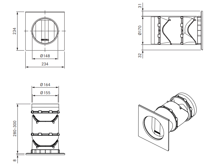 - Gabaryty (szer. x głęb. x wys.): Przejście ścienne Ø 170 x 280 – 300 mm